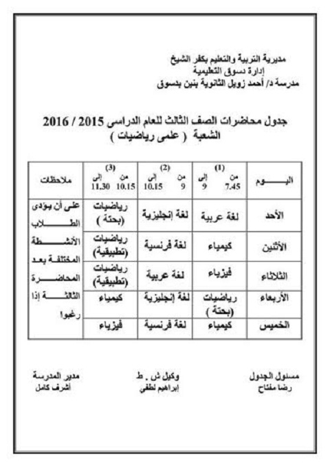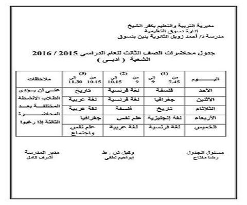 و"السبورة" تنشر جدول محاضرات لطلاب الثانوية العامة لمدرسة دكتور أحمد زويل الثانوية بنين بمدينة دسوق لجميع الشعب ( علمى علوم - علمي رياضة - ادبي ) ويشمل ثلاث محاضرات في كل يوم بخلاف الانشطة والتي تكون في نهاية اليوم اذا ما رغب الطلاب بادائها