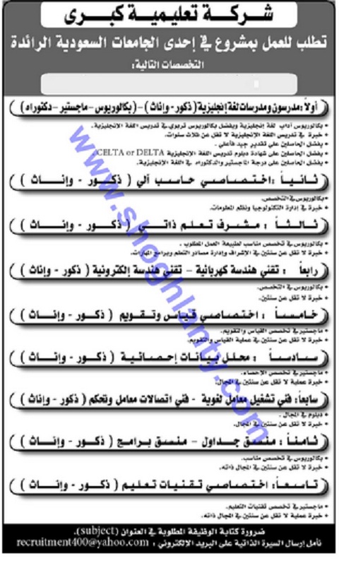وعلي الراغبين في التقديم إرسال السيرة الذاتية علي البريد الالكتروني : [email protected]