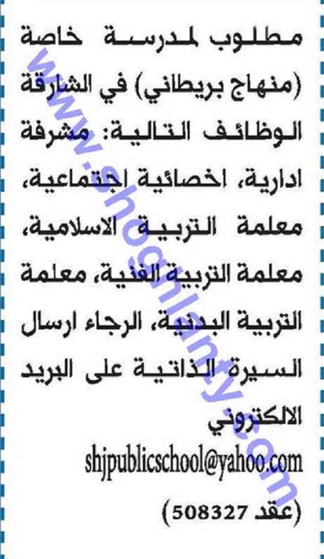 أعلنت مدرسة خاصة في إمارة الشارقة بدولة الإمارات العربية المتحدة عن حاجتها للتعاقد مع معلمين وذلك في المواد التالية: