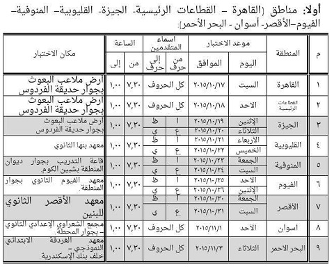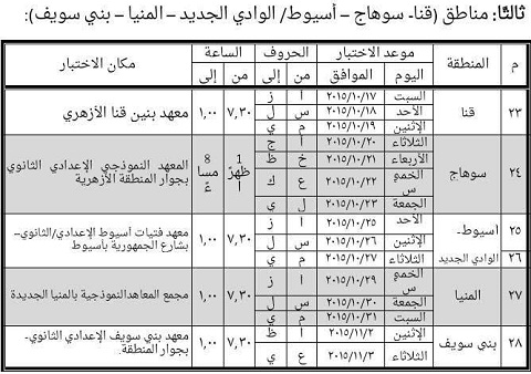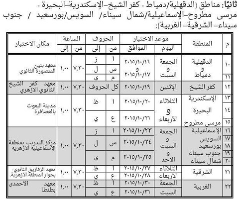 يعلن الأزهر الشريف عن مواعيد اختبار عمال الخدمات المعاونة في المسابقة المعلن عنها بتاريخ 1/8/2015م وفقًا للأماكن والمواعيد الآتية بعد، على أن يتقدم العمال في المواعيد المحددة ومعهم صور المستندات الموضحة على النحو التالي، وكذلك الأصول للاطلاع عليها: