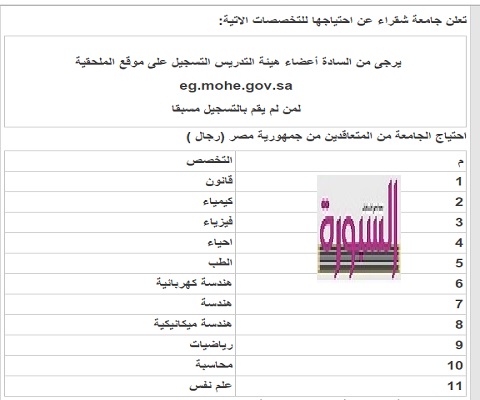 اعلنت جامعة شقراء السعودية عن الي اعضاء هئية تدريس من جمهورية مصر العربية في التخصصات الاتية: