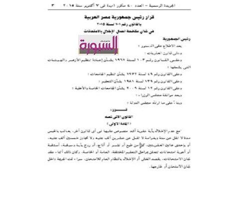 نشرت الجريدة الرسمية، فى عددها الصادر أمس الخميس، قرار جديد للرئيس عبد الفتاح السيسى، بقانون يعاقب بالحبس مدة لا تقل عن سنة وبغرامة لا تقل عن 20 ألف جنيه ولا تجاوز 50 ألف جنيه أو بإحدى هاتين العقوبتين، كل من طبع أو نشر أو أذاع، أو روج بأية وسيلة، أسئلة أو أجوبة امتحانات تتعلق بمراحل التعليم المختلفة، العامة أو الخاصة،