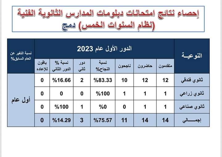 أعلنت وزارة التربية والتعليم والتعليم الفني عن الإحصاء المركزي لنتيجة امتحانات الدبلومات الفنية الدور الأول للعام ٢٠٢٣ والتي تضمنت التالي: