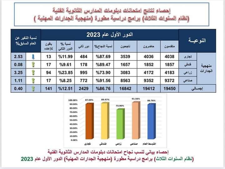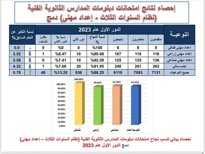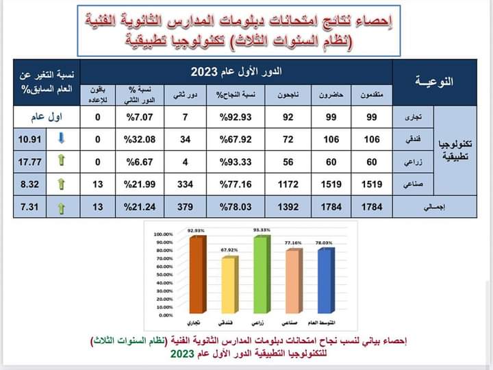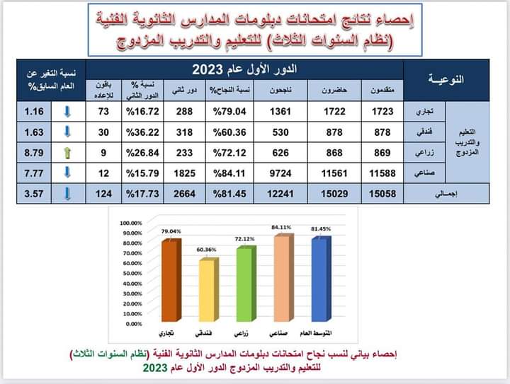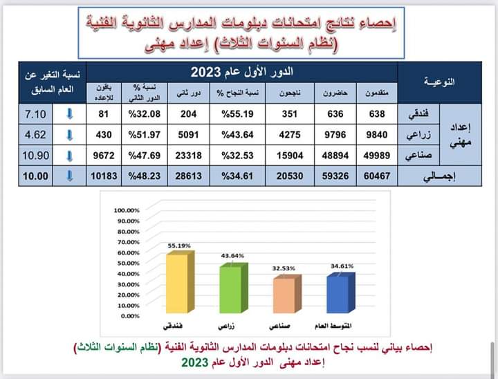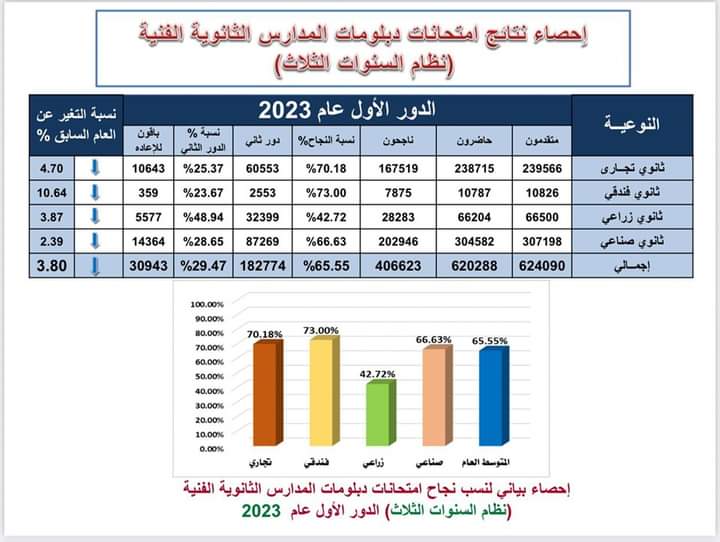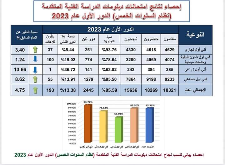 وزارة التربية والتعليم والتعليم الفني تعلن الإحصاء المركزي لنتيجة امتحانات الدبلومات الفنية الدور الأول للعام ٢٠٢٣