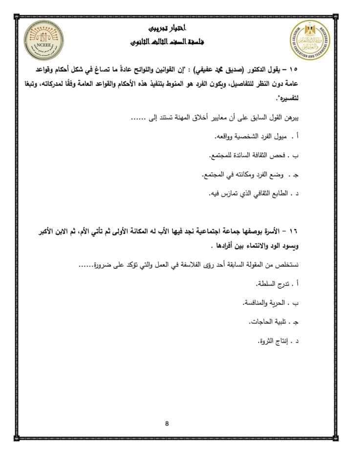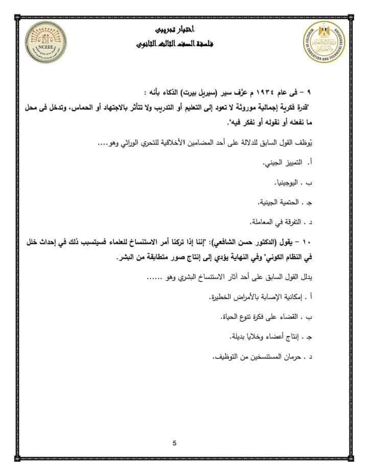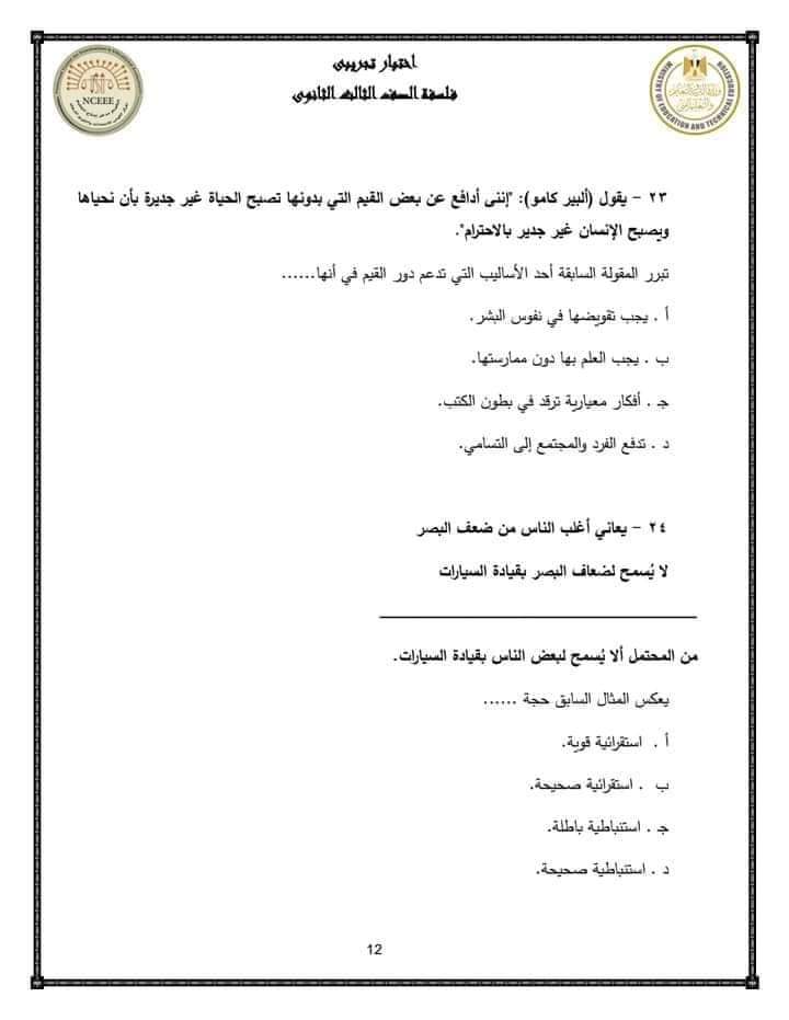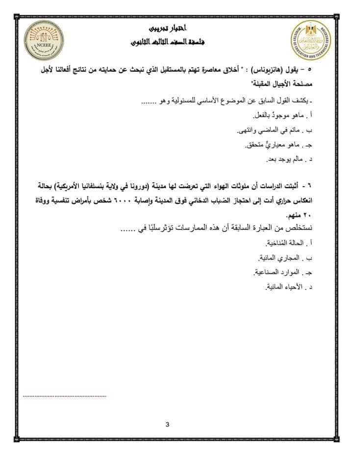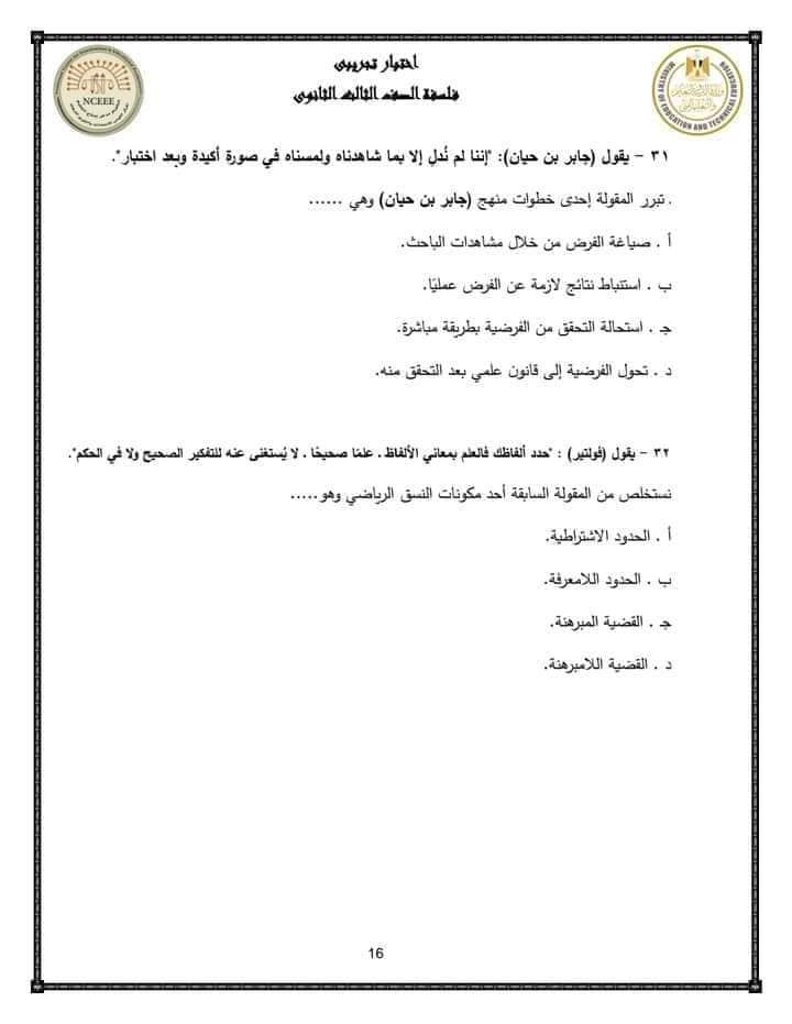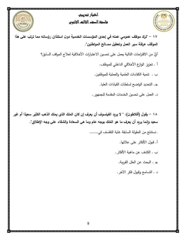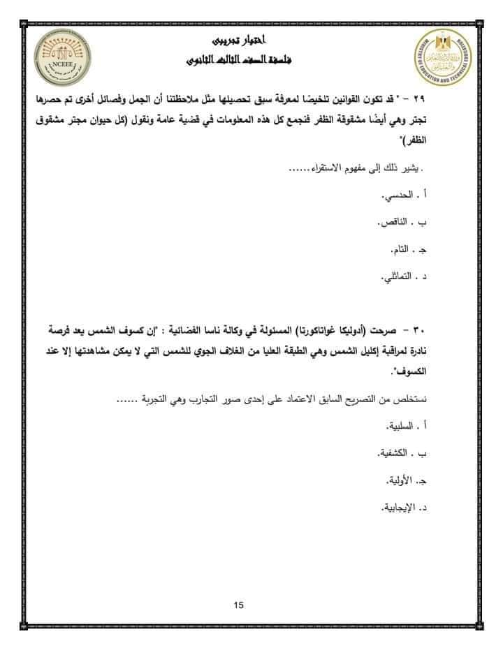 - التربية والتعليم تنشر النموذج الاسترشادي فى مادة "الفلسفة" للصف الثالث الثانوى بالإجابات