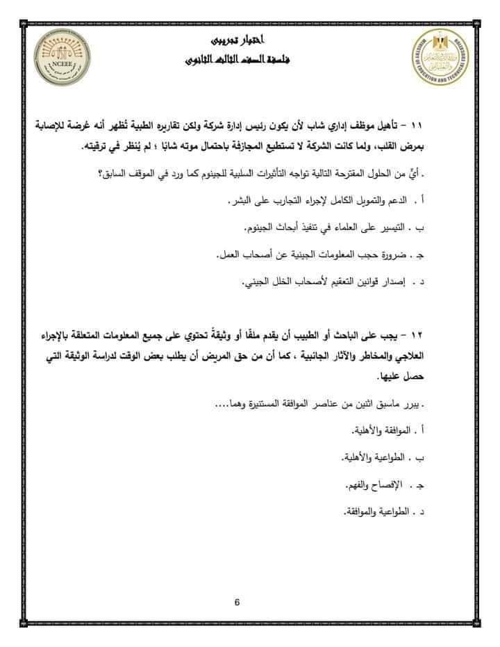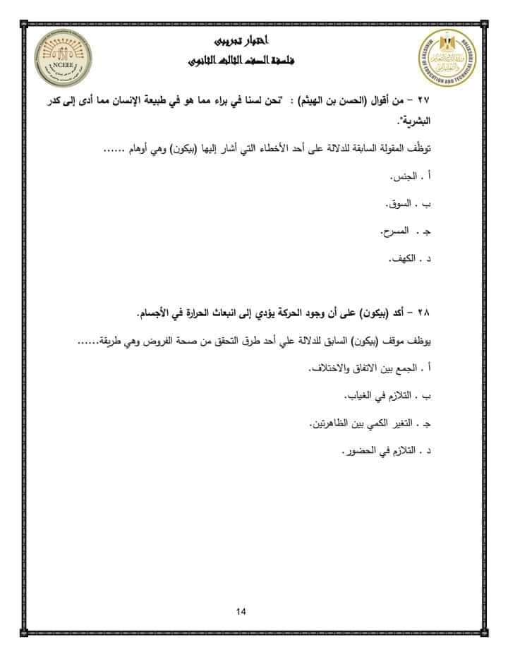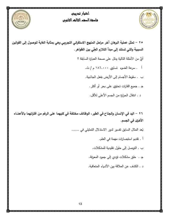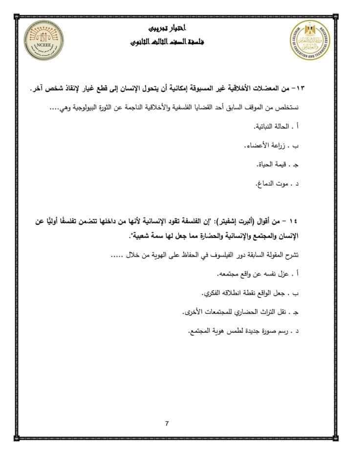 التربية والتعليم تنشر النموذج الاسترشادي فى مادة "الفلسفة" للصف الثالث الثانوى بالإجابات