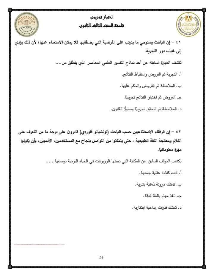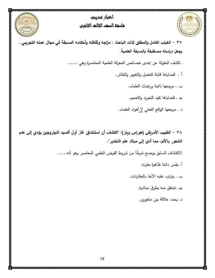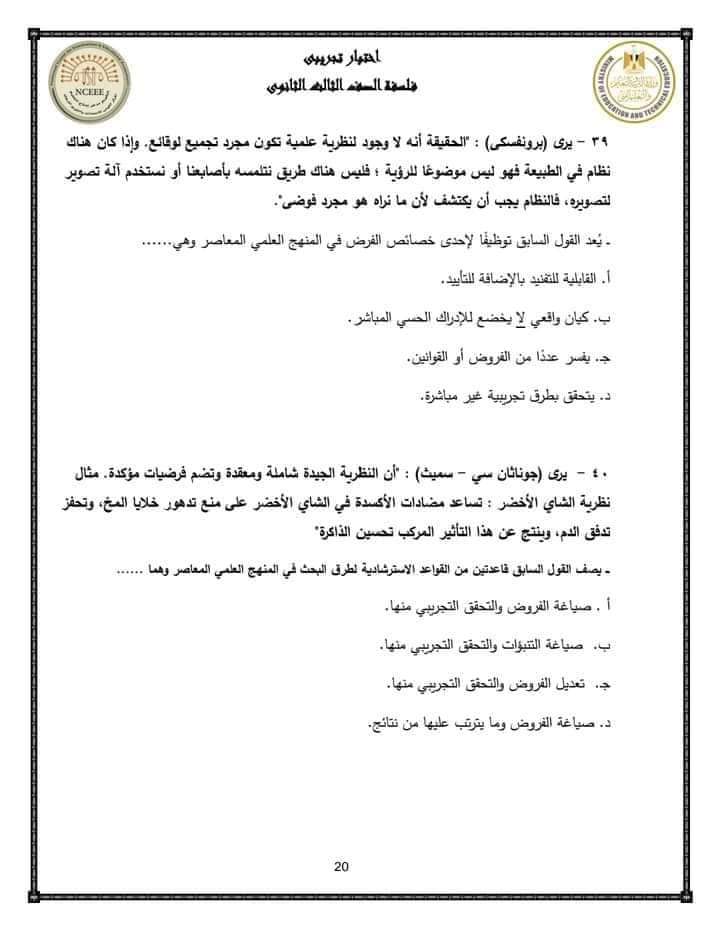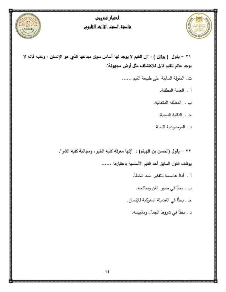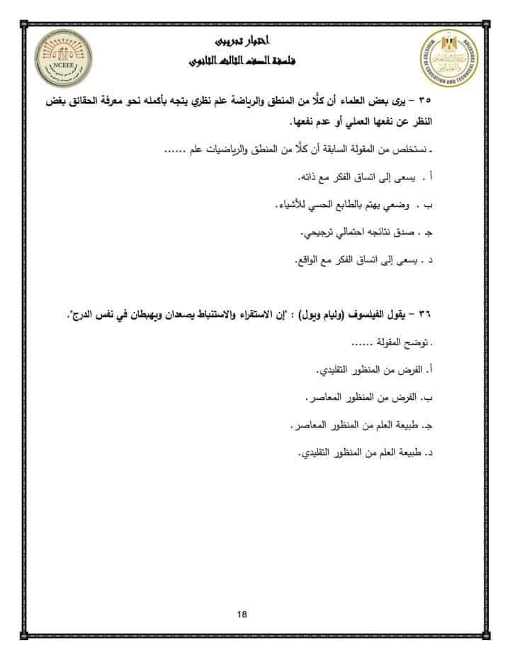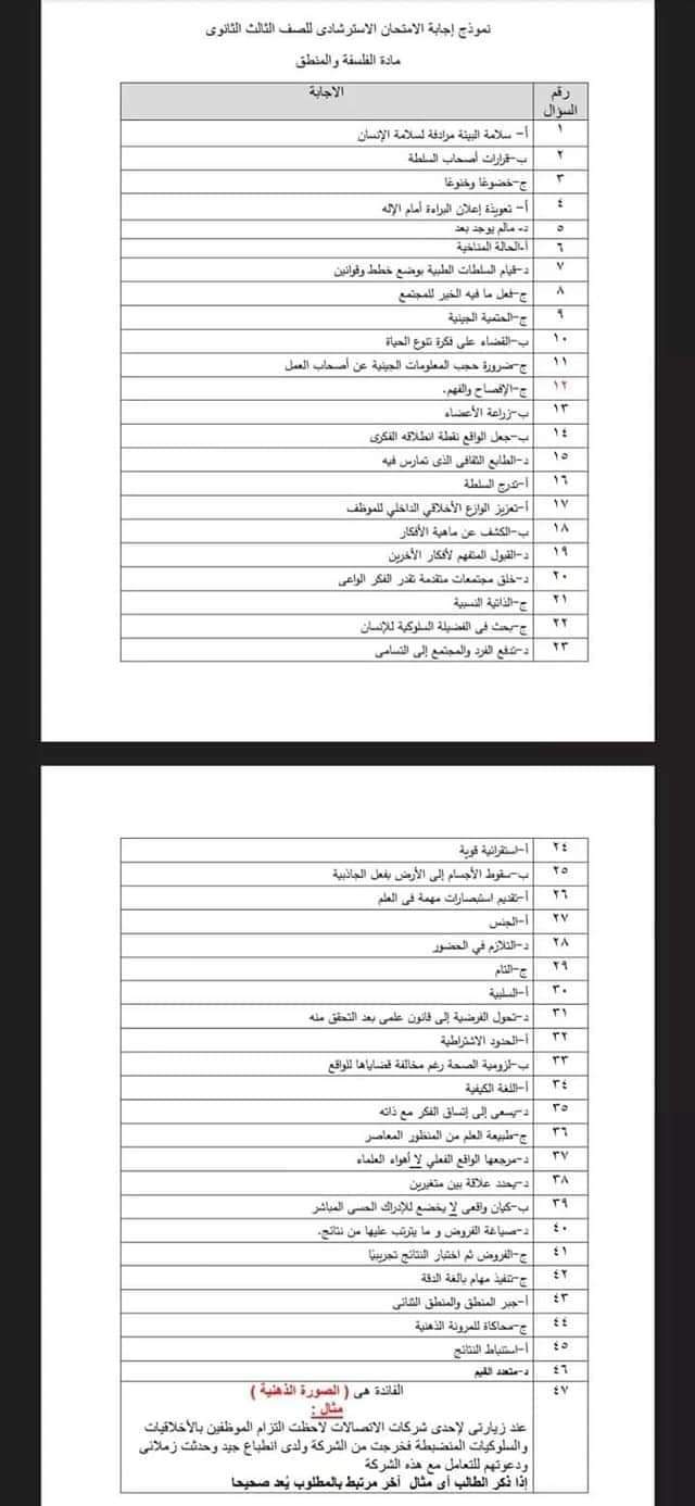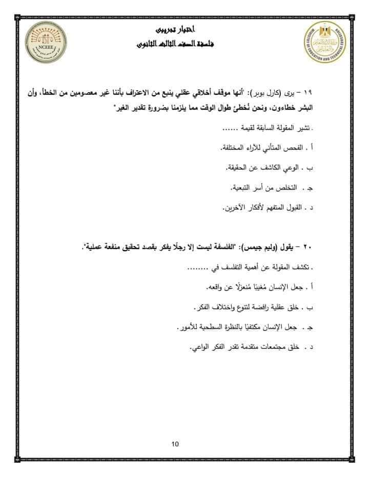 وينشر موقع "السبورة" النموذج الاسترشادي فى مادة "الفلسفة" للصف الثالث الثانوى بالإجابات والذى نشرته وزارة التربية والتعليم والتعليم الفنى.