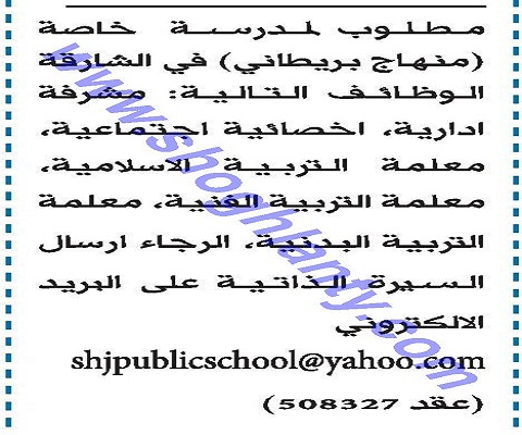 تعلن مدرسة خاصة بإمارة الشارقة بدولة الإمارات العربية المتحدة عن حاجتها للتعاقد مع عدد من المعلمين في المواد التالية: