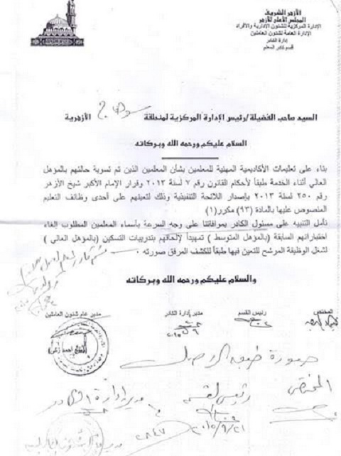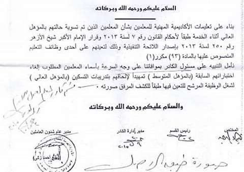 أصدر المجلس الاعلى للازهر منشور الى الادارة المركزية للشؤن الا دارية قسم الاكادر وذلك بناءا على تعليمات الاكاديمية المهنية للمعمين الذين تم تسويته حالتهم بالمؤهل العالى اثناء الخدمة بقرار الامام الاكبر شيخ الازهر رقم 250لسنة 2013 لتعيينهم على احدى وظائف التعليم يتم التنبية على مسؤل الكادر بموافاتنا على وجة السرعة باسماء.