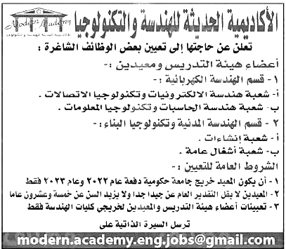 الاكاديمية الحديثة للهندسة والتكنولوجيا تعلن حاجتها إلى اعضاء هيئة التدريس ومعيدين