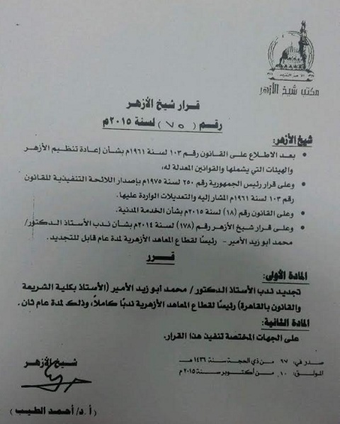 أصدر الدكتور أحمد الطيب شيخ الازهر ا القرار رقم (75) لسنة 2015 بتجديد الثقة فى الدكتور ابوزيد الأمير لندبة لمدة عام رئيسا لقطاع المعاهد الأزهرية لللاستمرار فى تطوير العملية التعليمية بالأزهر الشريف.