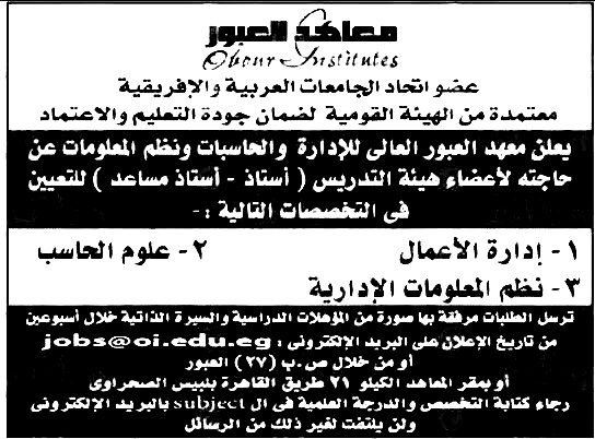 استاذ مساعد نظم معلومات ادارية……………. معهد العبور العالي. أعضاء هيئة التدريس. وظائف أعضاء هيئة التدريس. وظيفتك عندنا. السبورة. اخبار السبورة. وظيفة استاذ. وظيفة استاذ مساعد.
