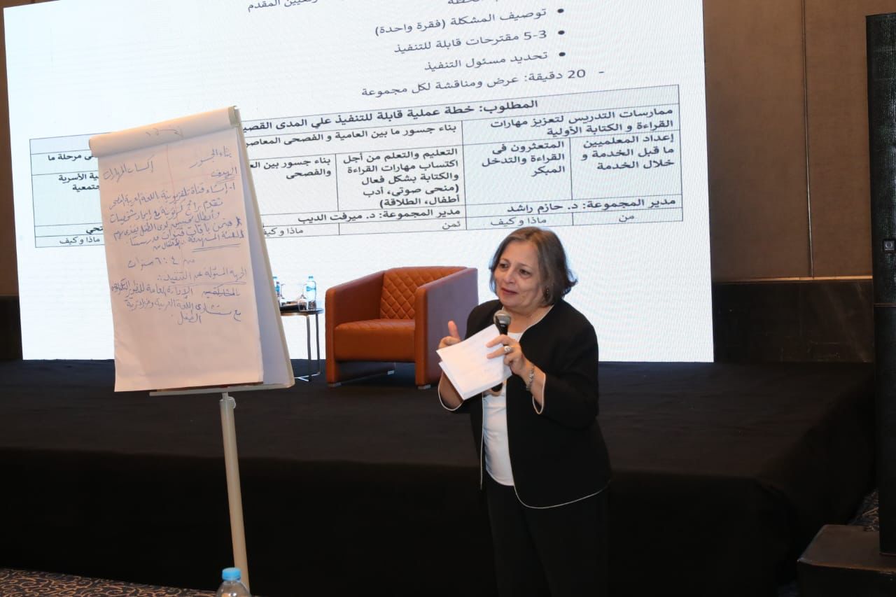 وشهدت مجموعات العمل مناقشة محاور الورشة الثلاث وهى "ممارسات التدريس لتعزيز مهارات القراءة والكتابة الأولية"، والمحور الثانى "بناء جسور ما بين العامية والفصحى المعاصر"، والمحور الثالث "تعزيز مهارات القراءة والكتابة في مرحلة ما قبل المدرسة"، حيث تم كتابة الخطة، وتوصيف المشكلة واستعراض المقترحات القابلة للتنفيذ، وعرض ومناقشة لكل مجموعة، وصولا لوضع خطة عملية قابلة للتنفيذ على المدى القصير والمتوسط (1-3 سنوات).