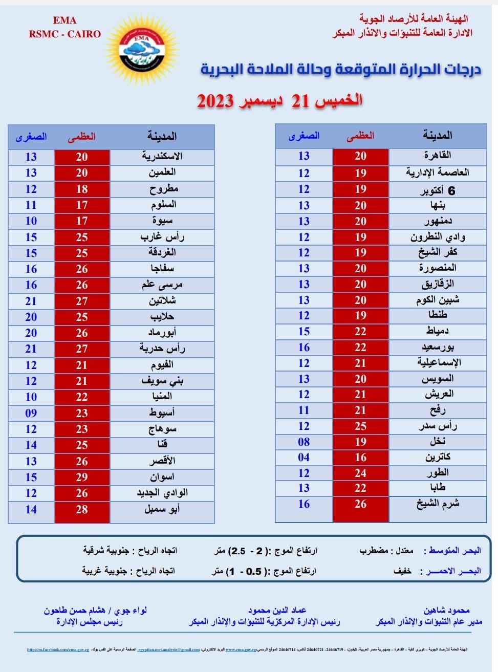 طالب خبراء هئية الارصاد الجوية بضرورة توخى الحذر من طقس اليوم الخميس 21 ديسمبر 2023، وذلك بسبب حالة الطقس والتغييرات الجوية التى تشهدها محافظات الجمهورية فى الوجهين البحرى والقبلى من تقلبات خلال الساعات المقبلة، التى تحمل تغيرات وتقلبات فى درجات الحرارة