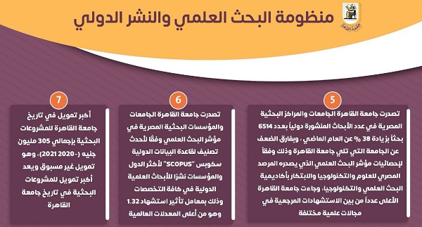 يُذكر أن جامعة القاهرة حققت أيضًا أكبر تمويل للمشروعات البحثية في تاريخها، بلغ إجماليه 380 مليون جنيه، ونفذت 25 مشروعًا بتكلفة إجمالية تصل إلى 80 مليون جنيه وكما وضعت الجامعة خططًا بحثية متقدمة، وتطويرت معاملها البحثية، ودعمت الفرق البحثية بكل الوسائل لزيادة جودة وكمية الأبحاث.