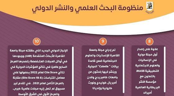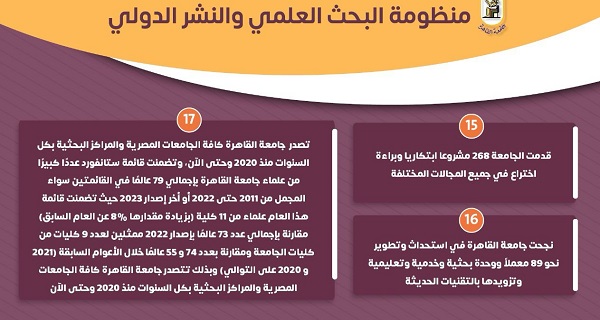 نجحت جامعة القاهرة، بإشراف الدكتور محمد الخشت رئيس الجامعة، في تعزيز نظامها للبحث العلمي والنشر الدولي خلال عام 2023، مستمرة في تنفيذ الرؤية الواضحة التي وضعتها قبل أكثر من 6 سنوات لتعزيز وتطوير البحث العلمي وقد أسفرت هذه الجهود عن تحقيق الجامعة لتقدم كبير، حيث ارتقى علماء وباحثو الجامعة في التصنيفات العالمية وزادت نسبة النشر الدولي وتقدمت المجلات العلمية الخاصة بالجامعة وتحقيق اكتشافات علمية وأثرية مهمة.