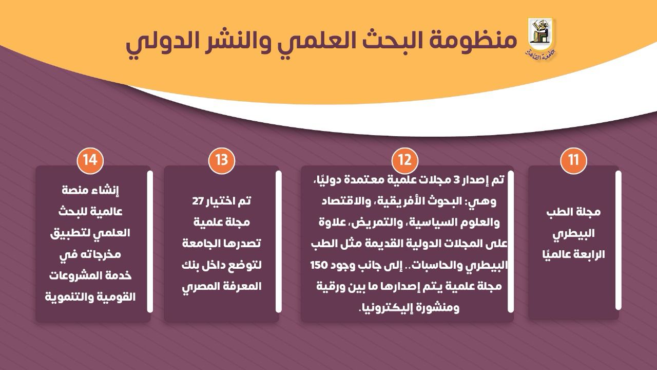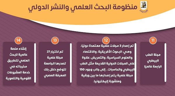 وأشار رئيس جامعة القاهرة إلى تقدم المجلات العلمية التابعة للجامعة على مدار العام، حيث حصلت مجلة العلوم البيطرية على المركز الثامن عالميًا في تصنيف المجلات العلمية في مجال الطب البيطري، وتصدرت مجلة البحوث المتقدمة الدوريات المصرية والأفريقية في تصنيف كلاريفيت العالمي.