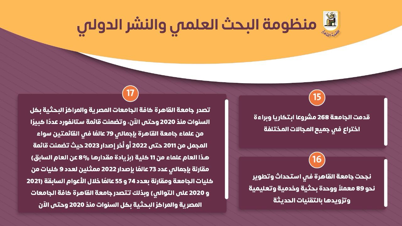 وأشار التقرير إلى استمرار تقدم جامعة القاهرةفي مجالات البحث والتطوير، حيث تم إدراج 79 عالمًا من علماء الجامعة في قائمة ستانفورد الأمريكية لأفضل 2% من العلماء على مستوى العالم. وحصل أساتذة الجامعة على 11 جائزة من جوائز الدولة، وارتفع معدل الاستشهادات الدولية للبحوث بنسبة 43%.