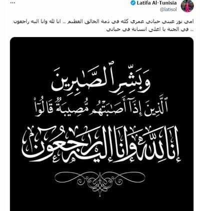 كتبت لطيفة، عبر صفحتها في موقع التدوينات الصغيرة "إكس"،: "أمي نور عيني حياتي عمري كله في ذمة الخالق العظيم.. إنا لله وانا إليه راجعون.. في الجنة يا أغلى إنسانة في حياتي".