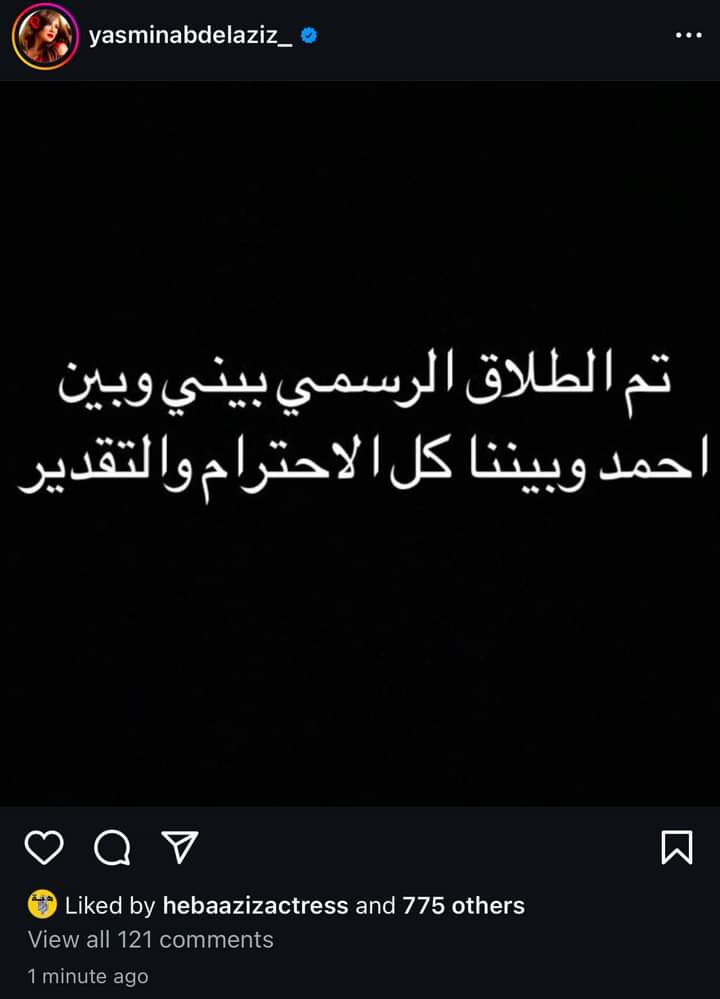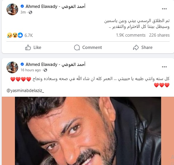 طلاق ياسمين عبدالعزيز من أحمد العوضى هو حديث مواقع السوشيال ميديا منذ ساعتين بعد أن كتبت على صفحتها الرسمية، تم الطلاق الرسمى بينى وبين أحمد العوضى وبيننا كل الأحترام، ليرد أحمد العوضى بنفس الجملة والعامل المشتر " بيننا كل الأحترام، تعرضت ياسمين عبدالعزيز لأزمة صحية بعد زواجها من العوضى سافرت على اثرها للعلاج بالخارج، والقرار المفاجئ صدم جمهور ياسيمين عبدالعزيز والعوضى بسبب قصتهما وارتباطهما القوى خلال السنوات الماضية حتى فى البرامج والمسلسلات كانت ياسمين عبدالعزيز " وحش الكون "