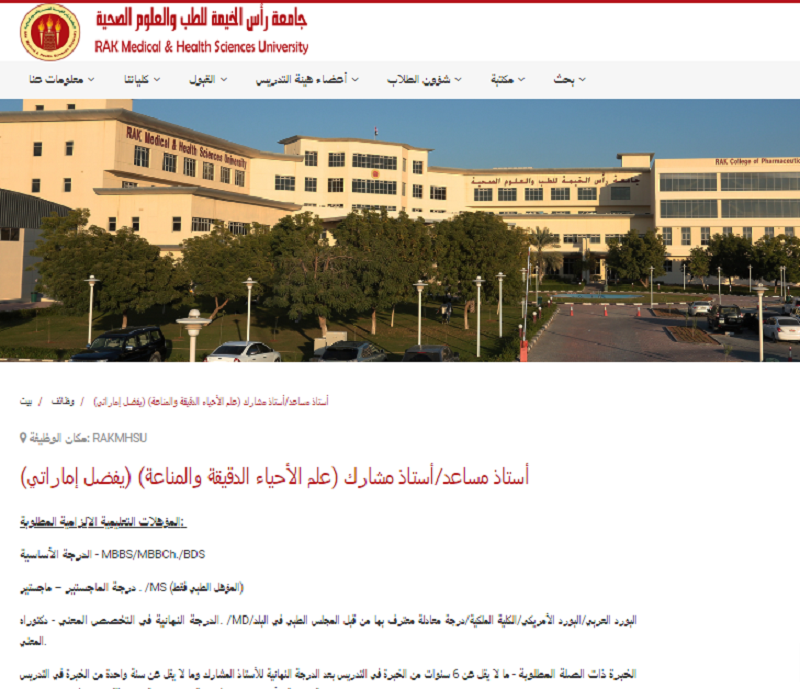 وظائف جامعه.. أعلنت جامعة رأس الخيمة للطب والعلوم الصحية في دولة الإماات العربية المتحدة عن وظائف أعضاء هيئة تدريس جديدة في عدد من التخصصات حيث تقدم الجامعة رواتب تنافسية للعاملين بها
