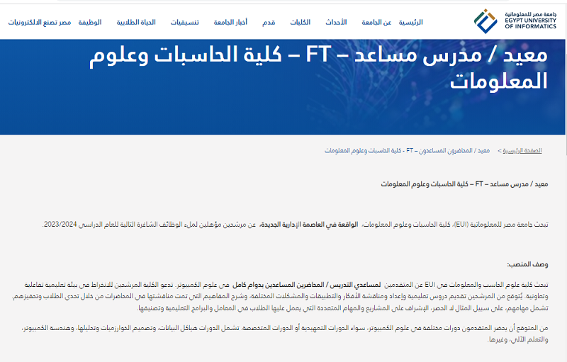 وظائف جامعه.. جامعة مصر للمعلوماتية تعلن عن وظائف جديدة لأعضاء هيئة التدريس