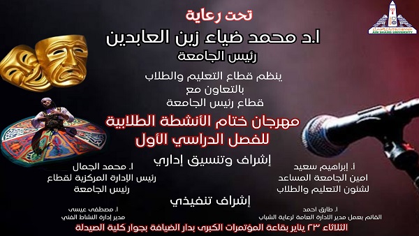 تحت رعاية الدكتور محمد ضياء زين العابدين، رئيس جامعة عين شمس، والدكتورة غادة فاروق نائب رئيس الجامعة، وفي ضوء ما شهده الفصل الدراسي الأول من فعاليات متميزة لكافة الأنشطة الطلابية، والتي شاركت بها جامعة عين شمس ومنها مهرجانات غنائية ومسرحية، مثل مهرجان إبداع ومسابقات الإكتفاء الذاتي للموسيقى، والكورال، والتمثيل المسرحي، والدورات الرياضية، مثل دورة الشهيد الرفاعي، ودوري أسرة طلاب من أجل مصر.