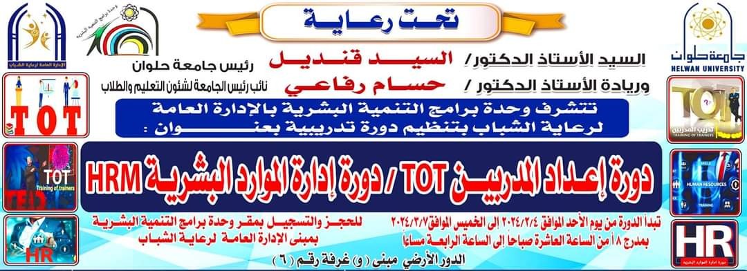 بدعم من الدكتور السيد قنديل، رئيس جامعة حلوان، تُعلن وحدة برامج التنمية البشرية في الإدارة العامة لرعاية الشباب بجامعة حلوان، عن تنظيم عدد من الدورات التدريبية، موجهة لطلاب الجامعة، بهدف تنمية مهاراتهم وتأهيلهم لسوق العمل، وذلك تماشيًا مع رؤية مصر 2030. وتقام هذه الدورات تحت رعاية الدكتور حسام رفاعي، نائب رئيس الجامعة لشؤون التعليم والطلاب.