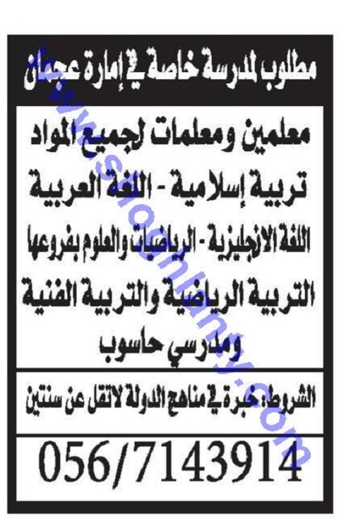 تعلن مدرسة خاصة في إمارة عجمان في دولة الامارات العربية المتحده عن حاجتها للتعاقد مع معلمين ومعلمات في جميع المواد وذلك وفقا للاتي: