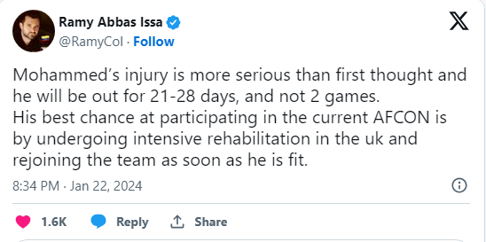 نشر رامي عباس عبر حسابه الرسمي على أحد مواقع التواصل الاجتماعي "إكس": "إصابة محمد صلاح أكثر خطورة مما كان يعتقد في البداية.. محمد صلاح سيغيب لمدة بين 21 إلى 28 يوما، وليس مباراتين كما تم توضيحه من قبل".