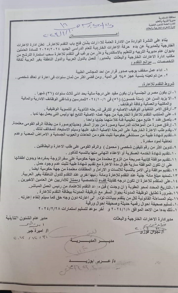 التعليم.. وجاء في خطاب مديرية التربية والتعليم بمحافظة الاسكندرية، أنه على المعلمين الراغبين في التقديم للإعارات الخارجية في الدول العربية، وغير الناطقة باللغة العربية التقديم عن طريق سحب استمارة الترشح من مكتب ادارة الاعارات الخاريجة والبعثان بمديرية التعليم بمحافظة الاسكندرية.