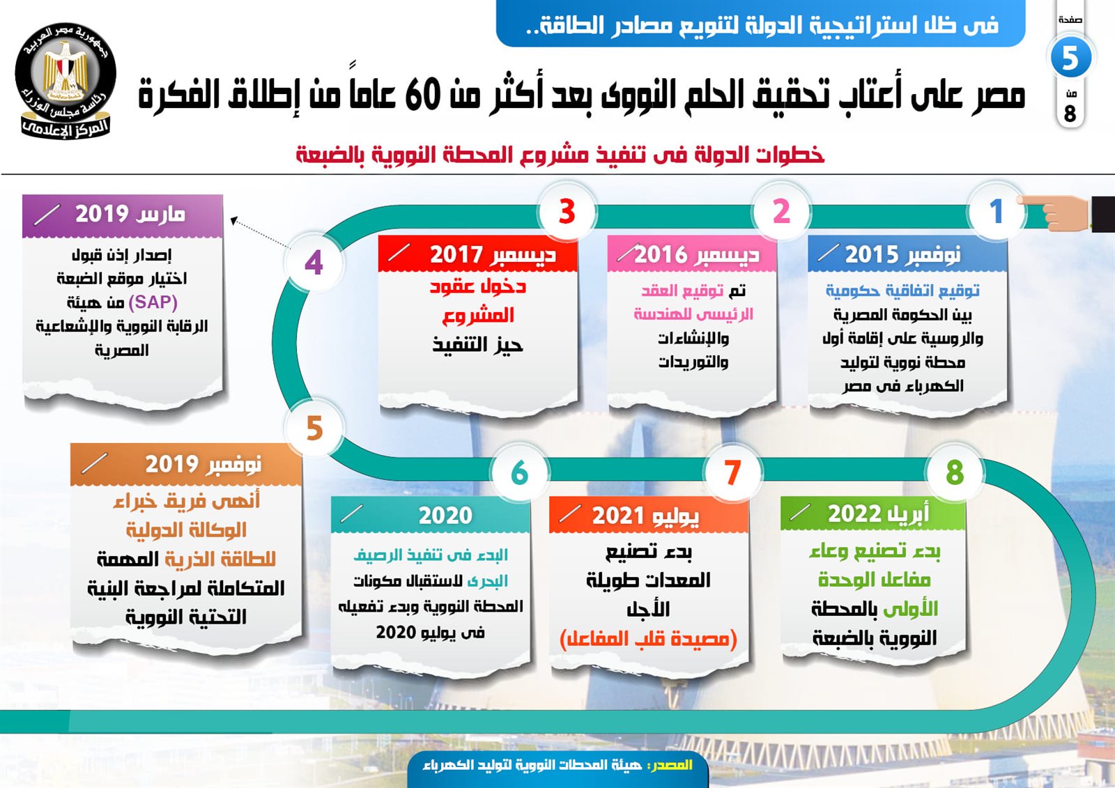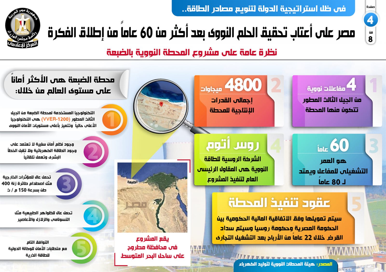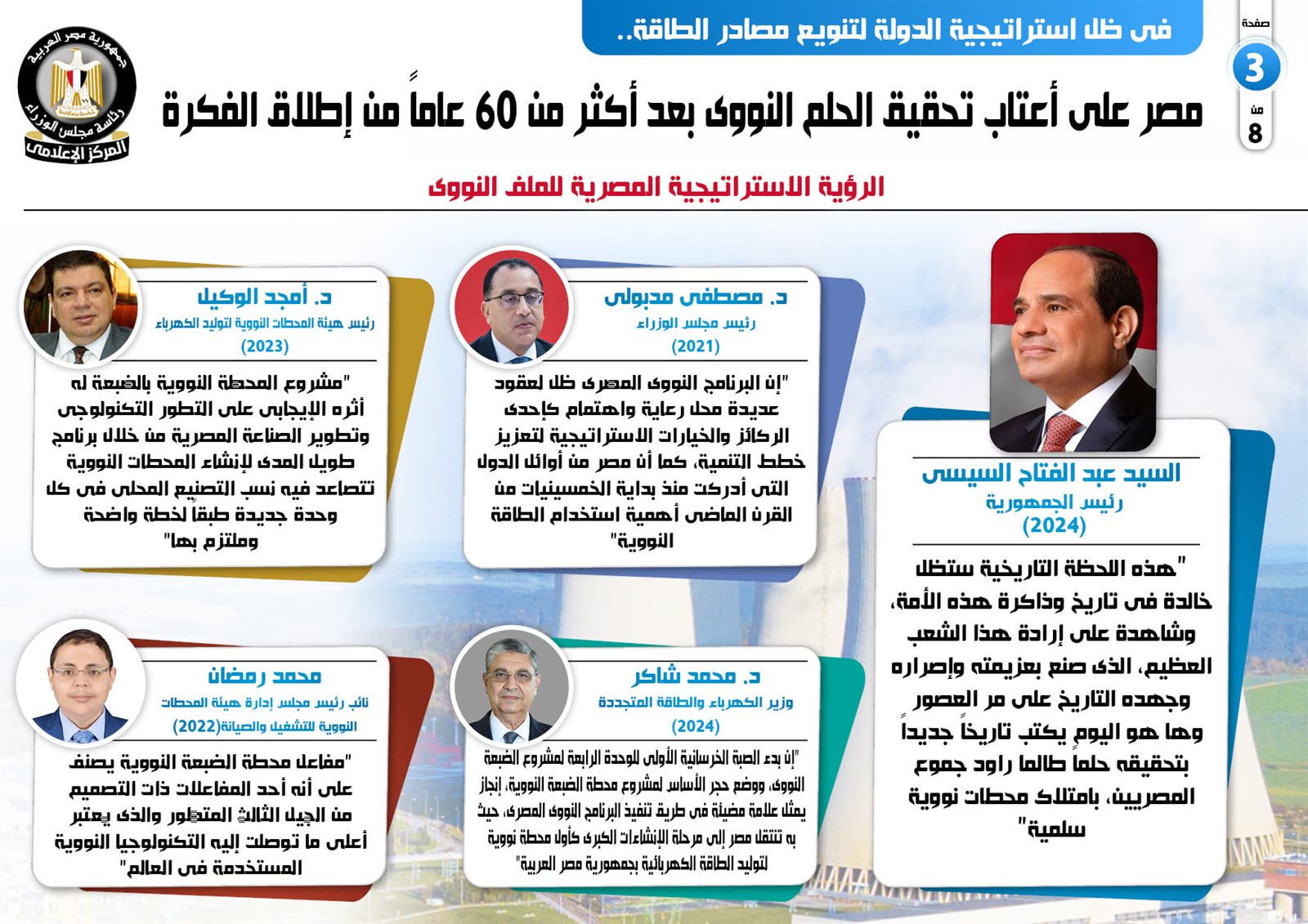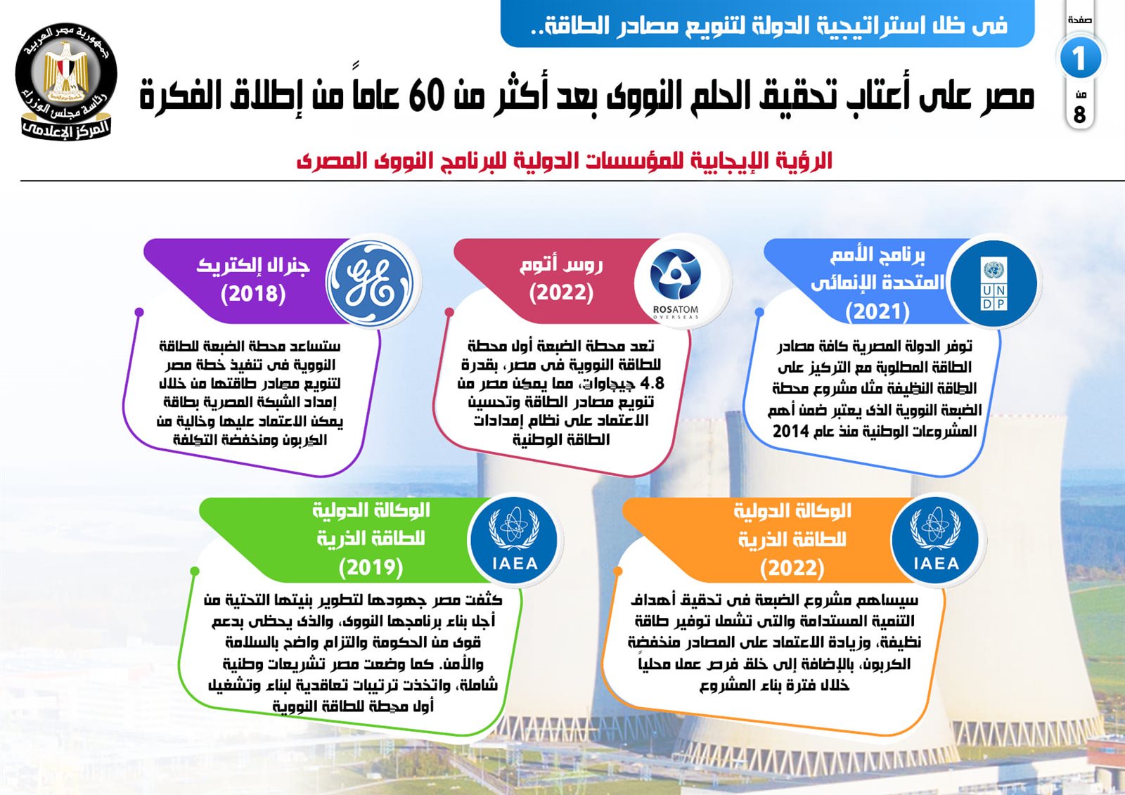 وفي هذا الصدد نشر المركز الإعلامي لمجلس الوزراء تقريرًا تضمن إنفوجرافات بعنوان "مصر على أعتاب تحقيق الحلم النووي بعد أكثر من 60 عامًا من إطلاق الفكرة" في ظل استراتيجية الدولة لتنويع مصادر الطاقة.