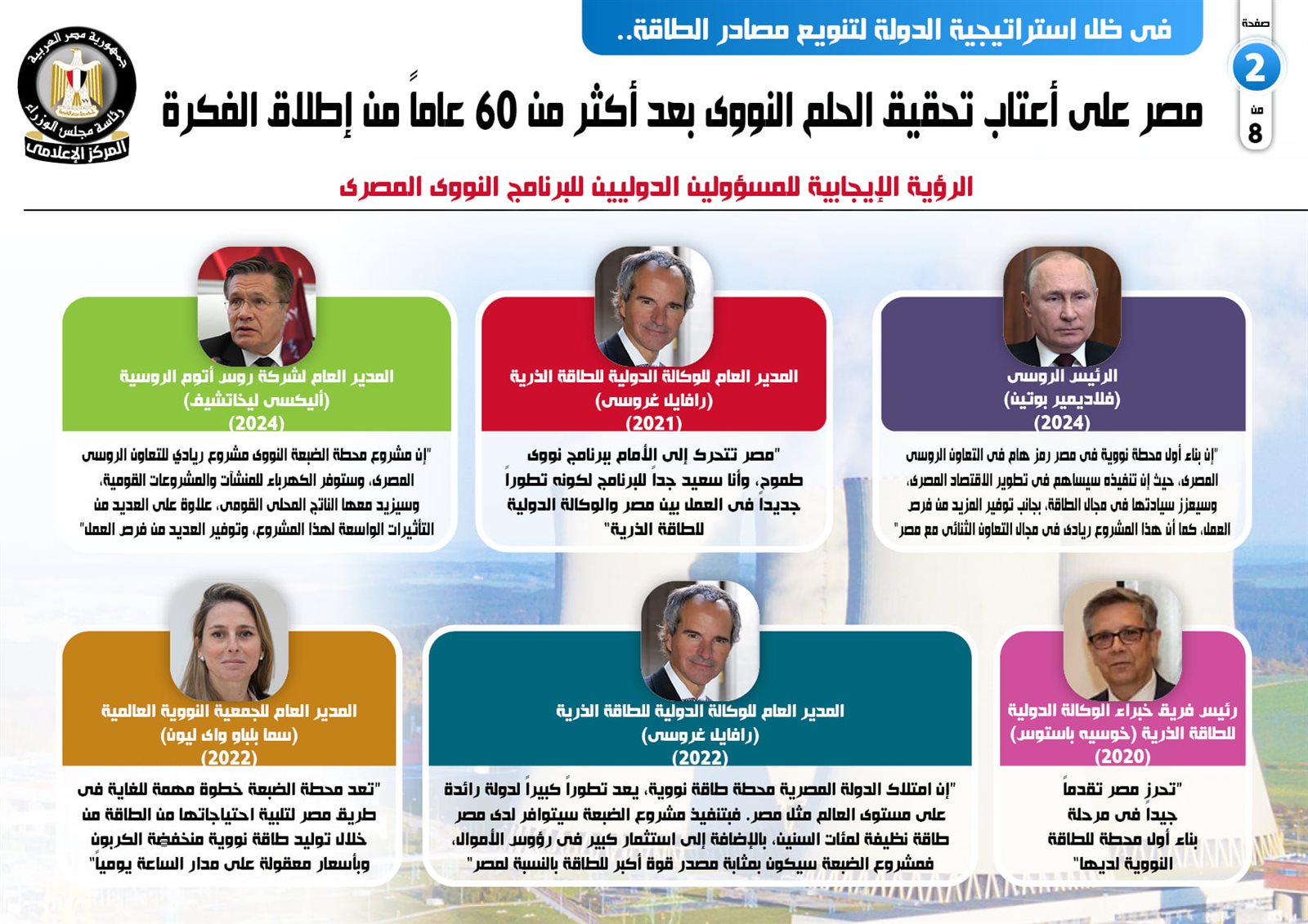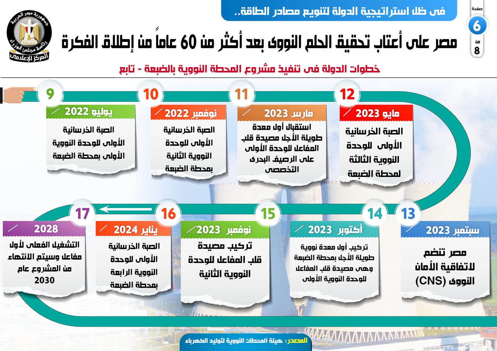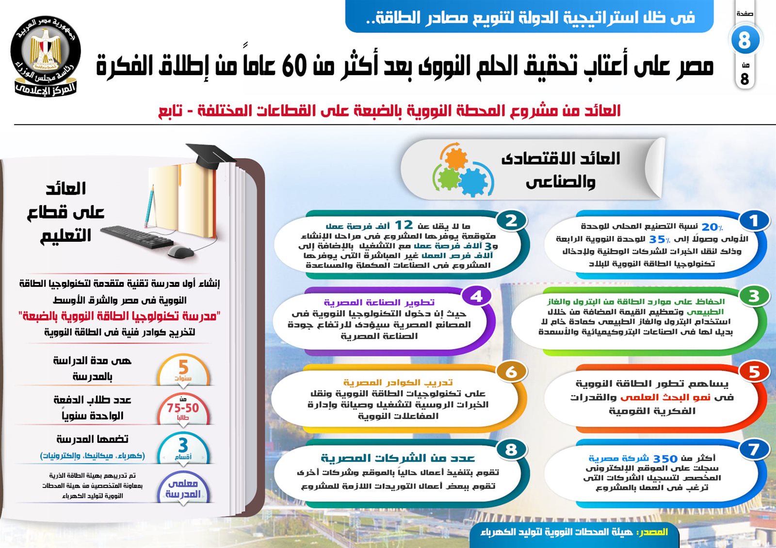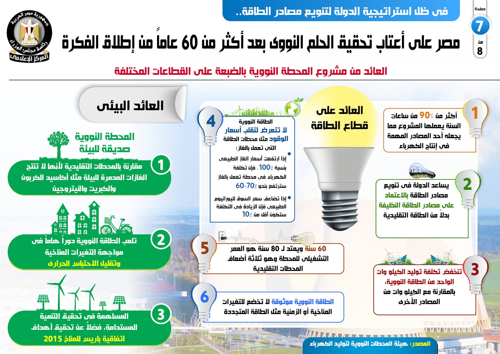 وفي هذا الصدد نشر المركز الإعلامي لمجلس الوزراء تقريرًا تضمن إنفوجرافات بعنوان "مصر على أعتاب تحقيق الحلم النووي بعد أكثر من 60 عامًا من إطلاق الفكرة" في ظل استراتيجية الدولة لتنويع مصادر الطاقة.