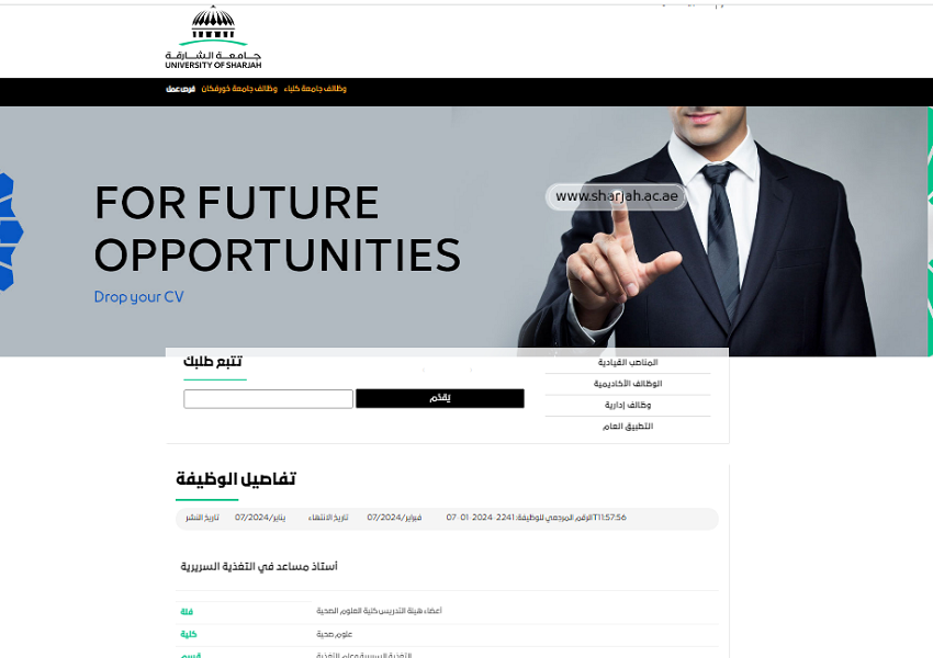 وظائف جامعه .. تعلن كلية العلوم الصحية في جامعة الشارقة في دولة الإمارات العربية المتحدة عن وظائف أعضاء هيئة التدريس جديدة في قسم التغذية السريرية وعلم التغذية وهي تعد واحدة من كبري الجامعات الخليجية حيث تقدم الجامعة مرتبات تنافسية لكافة العاملين بها.