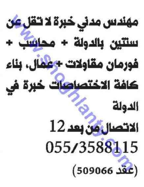 تعلن دولة الامارات عن حاجاتها لمهندسين مدني شرط الخبرة لا تقل عن سنتين بالدولة ولمحاسبين وعمال بناء في كافة الاختصاصات.