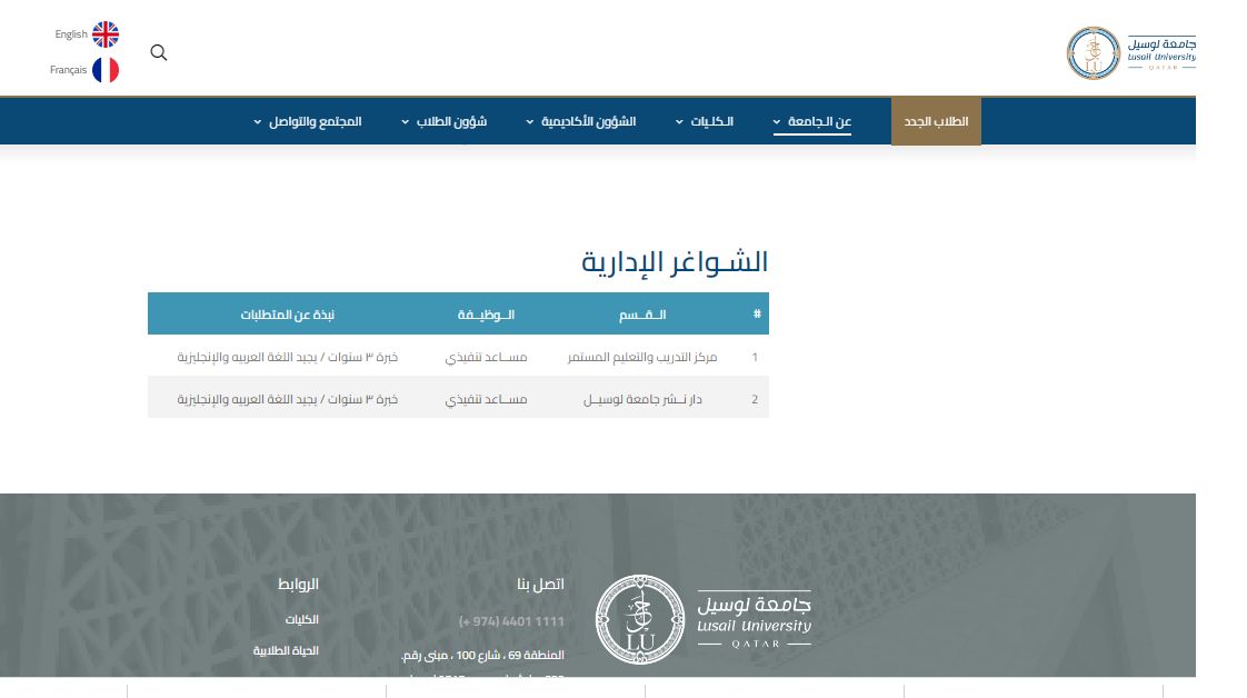 وظيفة جامعه..أعلنت جامعة لوسيل بدولة قطرعن حاجتها لشغل عدد من الوظائف الأكاديمية الشاغرة لـ أعضاء هئية تدريس ( محاضر – أستاذ مشارك – أستاذ – أستاذ مساعد " فى مختلف التخصصات بجميع كلياتها بالأضافة الى عدد من الوظائف والإدارية في تخصصات مختلفة.