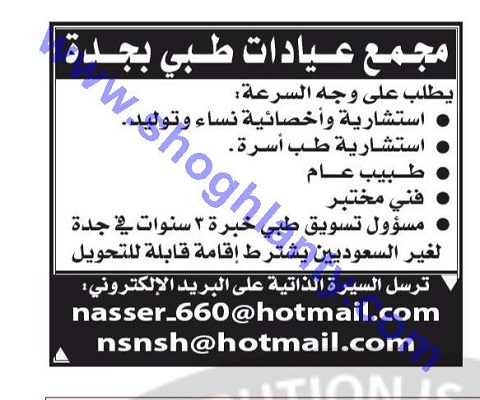 أعلن مجمع عيادات طبي بمدينة جدة بالمملكة العربية السعودية عن حاجته للتعاقد مع اطباء علي وجه السرعة وذلك في التخصصات التالية:
