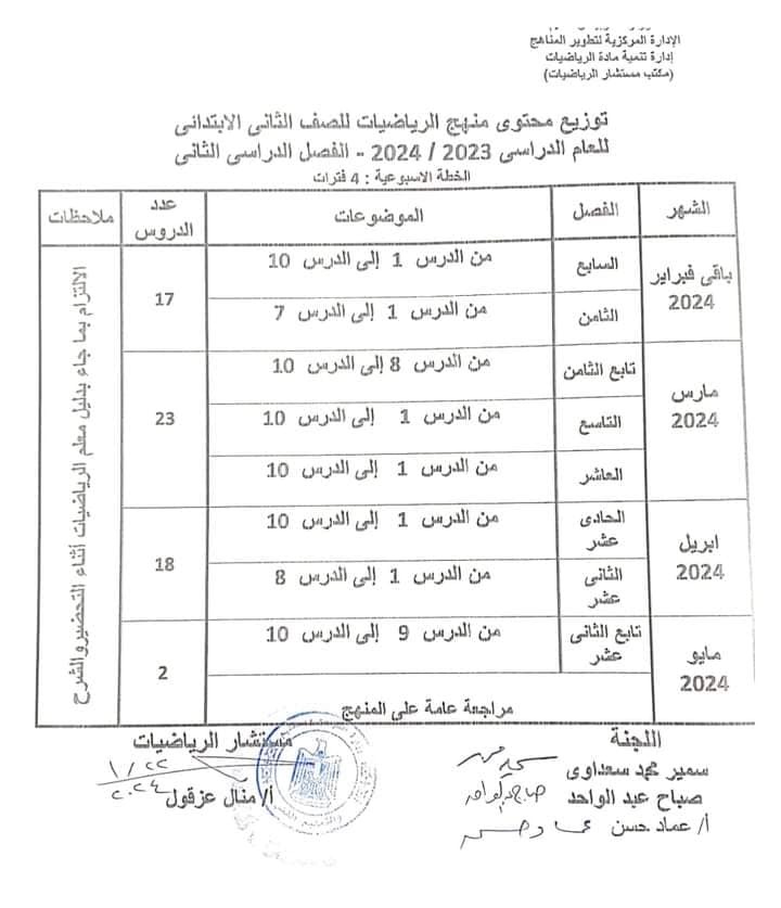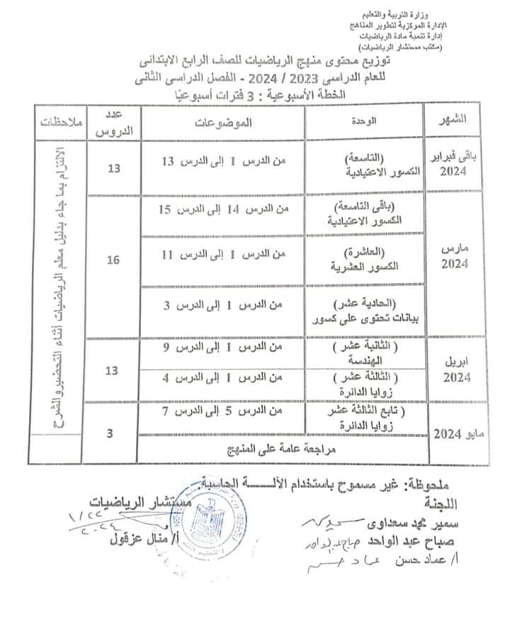 - باقي شهر فبراير2024: الوحدة الثامنة عمليات على الكسور من الدرس 1 إلى 4، والوحدة التاسعة النسبة وتطبيقتها من الدرس 1 إلى الدرس 6.
