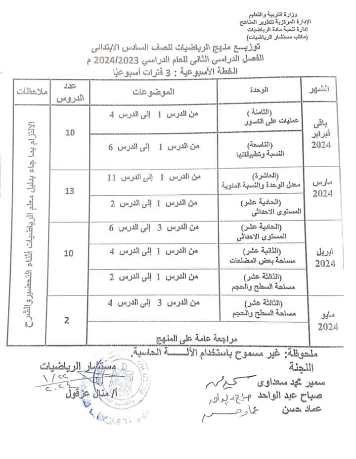 - باقي شهر فبراير2024: الوحدة التاسعة الكسور الاعتيادية من الدرس 1 إلى الدرس 13.