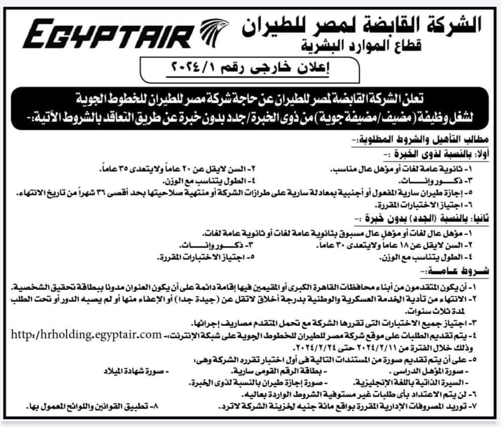 وظائف شركة مصر للطيران .. أعلنت شركة مصر للطيران عن وظائف جديدة متاح وذلك للعمل “مضيف أو مضيفة” جوية من ذوي الخبرة أو بدون خبرة وفقا للشروط الواردة في نص الإعلان التالي: