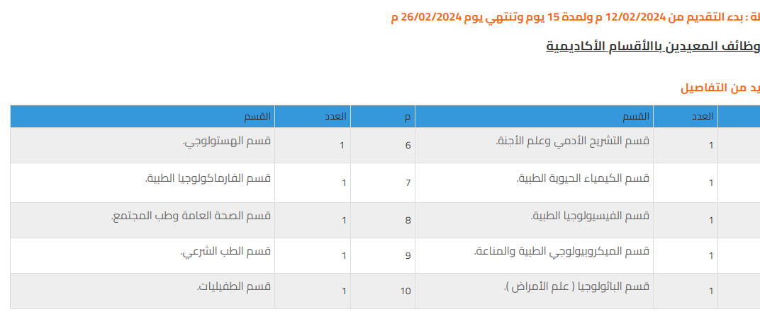 اعلنت جامعة أسوان عن حاجتها لشغل وظائف أعضاء هئية تدريس من المعيدين بالأقسام الأكاديمية وأطباء مقيمين بالأقسام الإكلينيكية عن طريق الإعارة لمدة ثلاث سنوات من الجهات المكلفين عليها،ويبدأ التقديم من 12/02/2024 م ولمدة 15 يوم وتنتهي يوم 26/02/2024 م
