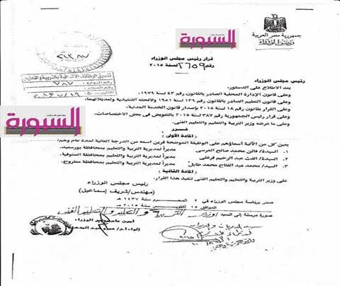 اصدر مجلس الوزراء القرار رقم 2659 لسنة 2015 بتاريخ 19/10/2015 بخصوص تعيين مديري مديريات التربية والتعليم بالمنوفية وبورسعيد ومطروح .