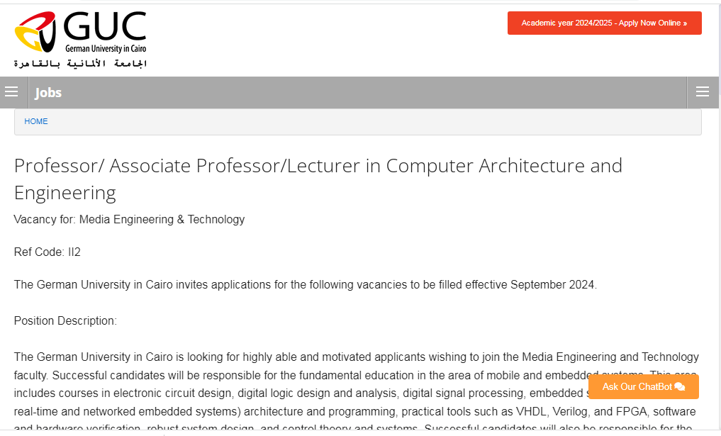 وظيفة جامعه.. تعلن كلية هندسة وتكنولوجيا الإعلام في الجامعة الألمانية بالقاهرة عن وظائف أعضاء هيئة التدريس وذلك في تخصص أستاذ / أستاذ مشارك / محاضر في هندسة وهندسة الكمبيوتر حيث تعد الجامعة الألمانية في القاهرة (GUC) هي مؤسسة تعليمية خاصة تأسست في عام 2003 كمشروع مشترك بين مصر وألمانيا.