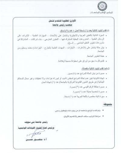 • السيرة الذاتية للمرشحين لرئاسة جامعة طنطا 2024، باللغتين العربية والانجليزية وتشتمل على الأبحاث – المهارات العلمية – الاشراف على الرسائل العلمية – المشروعات البحثية المشارك فيها- التعاون الخارجي – بناء شراكات- المشاركة في مشروعات تطوير التعليم الجامعي... الخ).