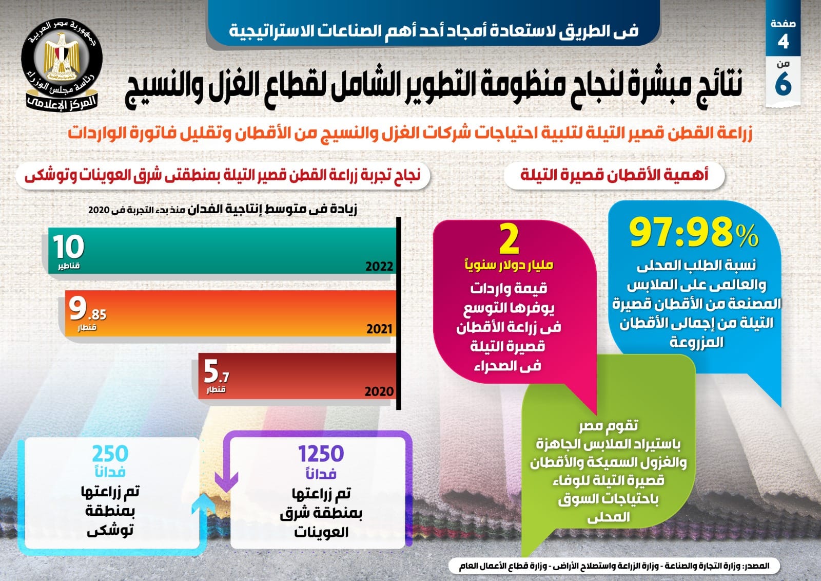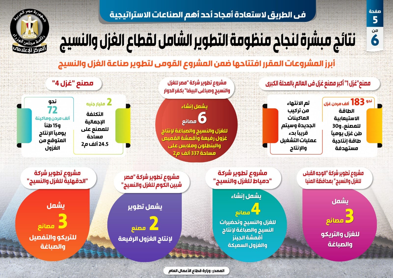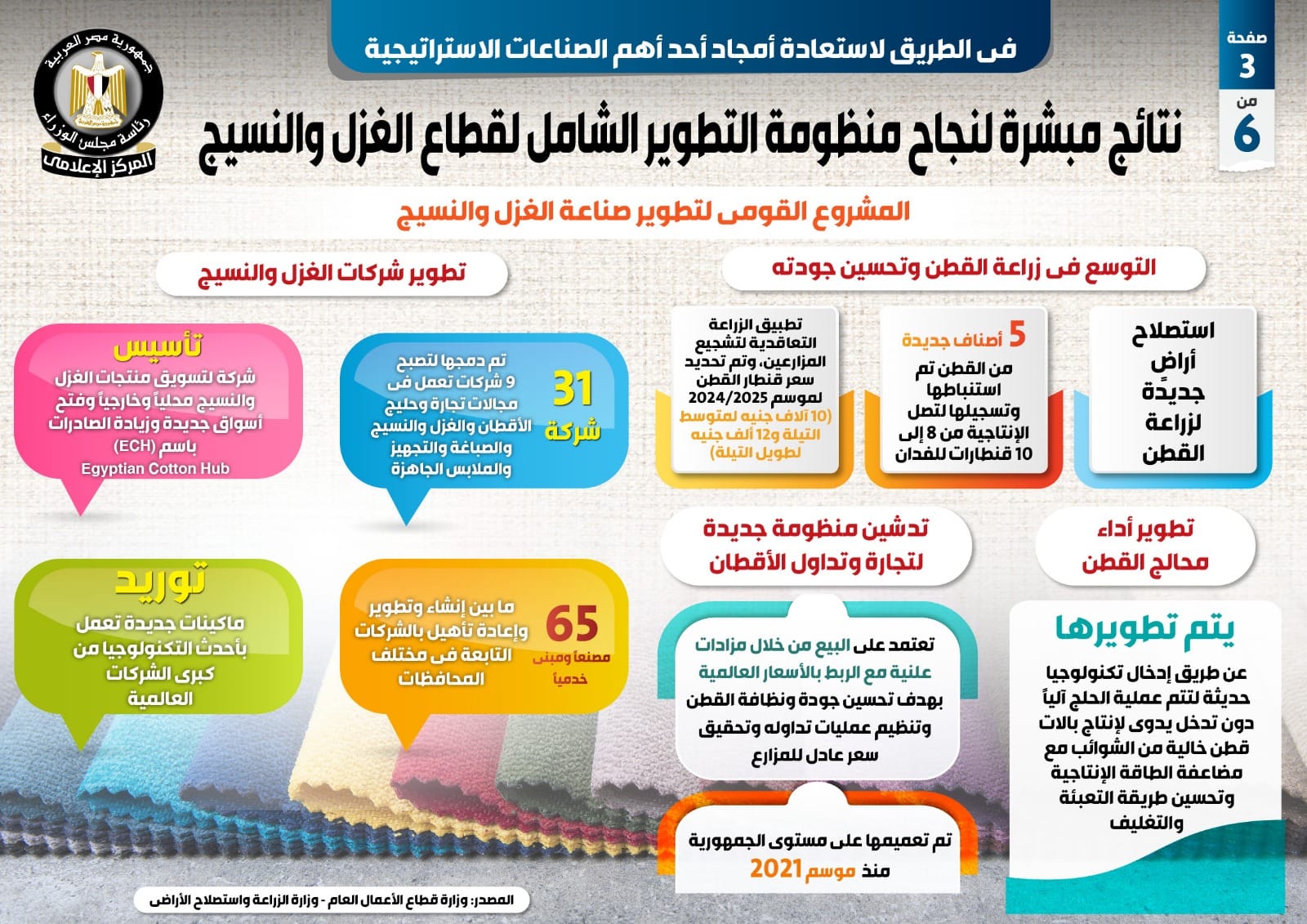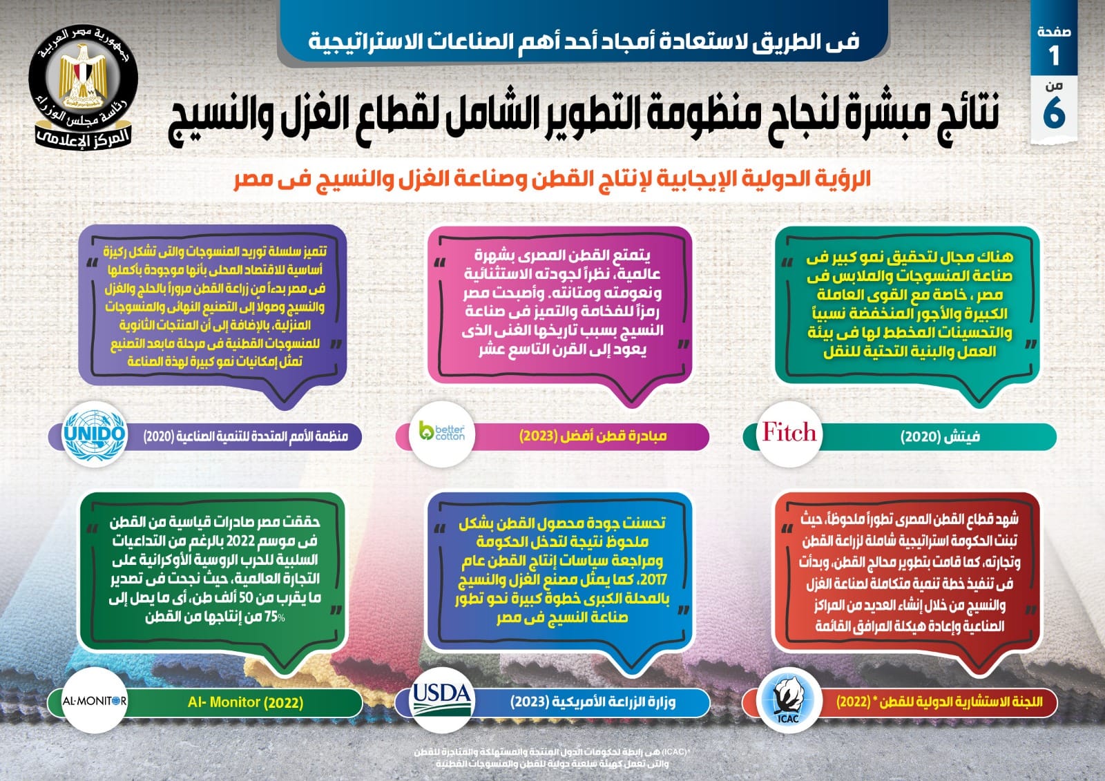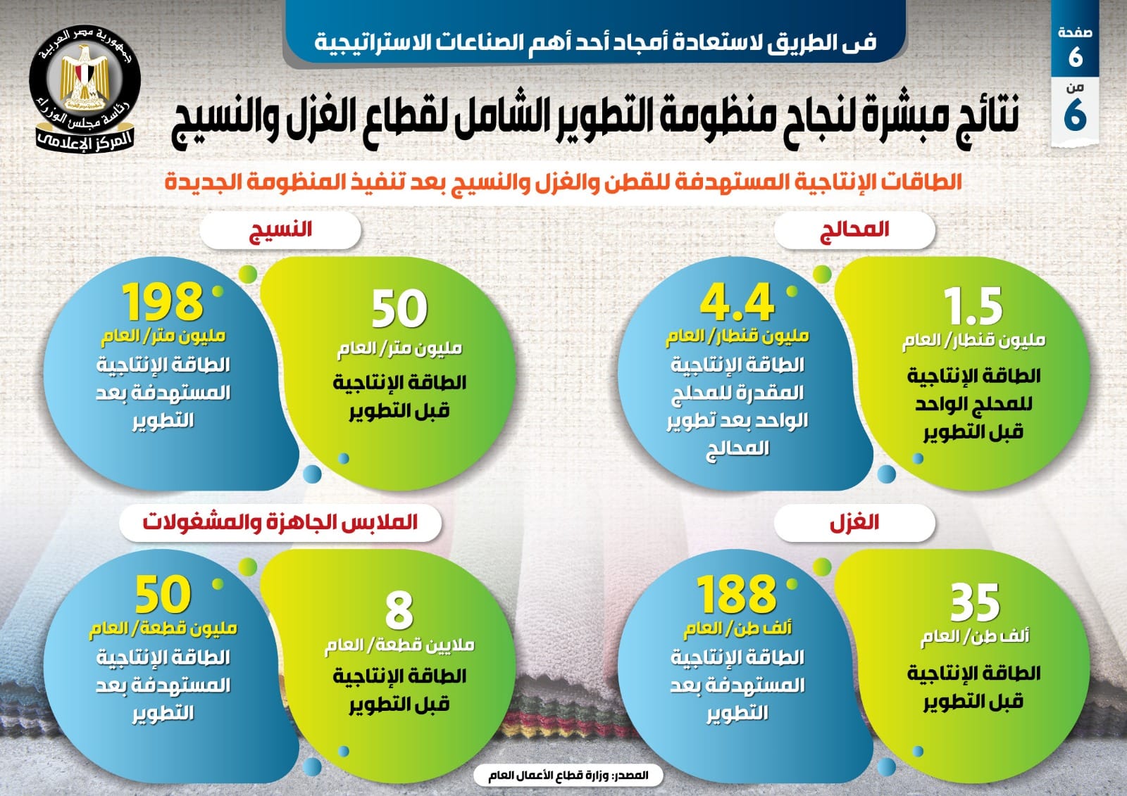 وفي هذا الصدد نشر المركز الإعلامي لمجلس الوزراء تقريرًا تضمن إنفوجرافات تسلط الضوء على النتائج المبشرة لنجاح منظومة التطوير الشامل لقطاع الغزل والنسيج، وذلك في الطريق لاستعادة أمجاد أحد أهم الصناعات الاستراتيجية.