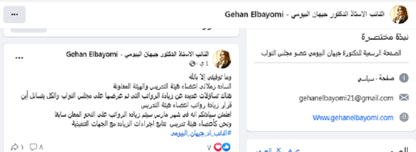 وتابعت النائبة جيهان البيومي تصريحاتها قائلةً: "نحن كأعضاء هيئة تدريس سوف نقوم بمتابعة الإجراءات الخاصة بصرف زيادة مرتبات شهر مارس مع الجهات التنفيذية".