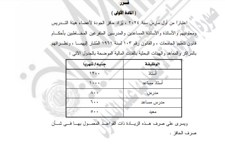 وبخصوص زيادة حافز الجودة لـ أعضاء هيئة تدريس جاءت المادة الأولى من القرار على أنه اعتبارا من أول مارس سنة 2024، يُزاد حافز الجودة لـ أعضاء هيئة التدريس ومعاونيهم والأساتذة والأساتذة المساعدين والمدرسين المتفرغين المخاطبين بأحكام قانون تنظيم الجامعات، والقانون رقم 103 لسنة 1961، المشار إليهما، ونظرائهما من المراكز والمعاهد والهيئات البحثية بالفئات المالية الموضحة بالجدول الآتى:
