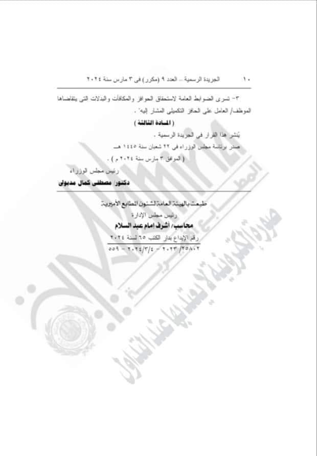 نشرت الجريدة الرسمية في عددها الصادر أمس الاثنين، الموافق 5-3-2024، عدة قرارات جديدة وافق عليها الدكتور مصطفى مدبولي، رئيس مجلس الوزراء، وذلك بشأن الحد الأدنى لـ الأجور وزيادة حافز الجودة لـ أعضاء هيئة التدريس في جميع الجامعات المصرية الحكومية، على ان تتم صرف الزيادة بشأن حافز الجودة، وذلك بدء من شهر مارس الجاري، وتصرف هذه الزيادة في حافز الجودة مع صرف مرتبات شهر مارس الجاري 2024.