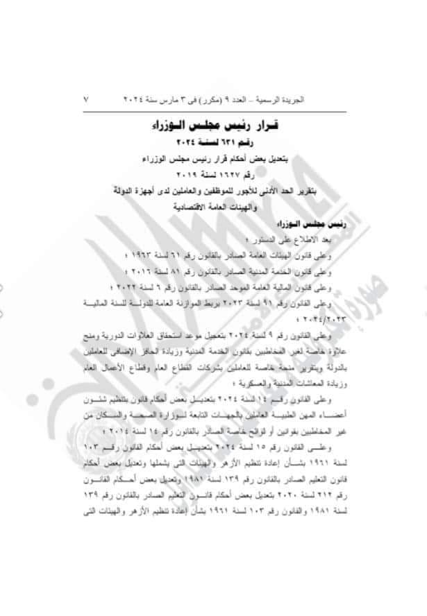 كما تم نشر العديد من القرارات بعد موافقة مجلس الوزراء برئاسة الدكتور مصطفى مدبولي، بشأن رفع الحد الأدنى للأجور لجميع العاملين بالوزرارات والهيئات والمؤسسات الحكومية، على أن يبدأ صرف الزيادة في الحد الأدنى للأجور من أول مارس 2024، على ان يتم صرف الزيادة في المرتبات لشهر مارس الجاري.