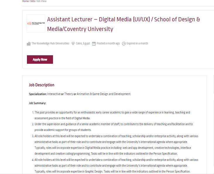 وظيفة جامعه.. أعلنت كلية التصميم والإعلام في فرع جامعة كوفنتري في مصر عن وظائف أعضاء هيئة تدريس في تخصص محاضر مساعد في الوسائط الرقمية حيث تعد جامعة كوفنتري (Coventry University) هي جامعة بريطانية تقع في مدينة كوفنتري في إنجلترا.